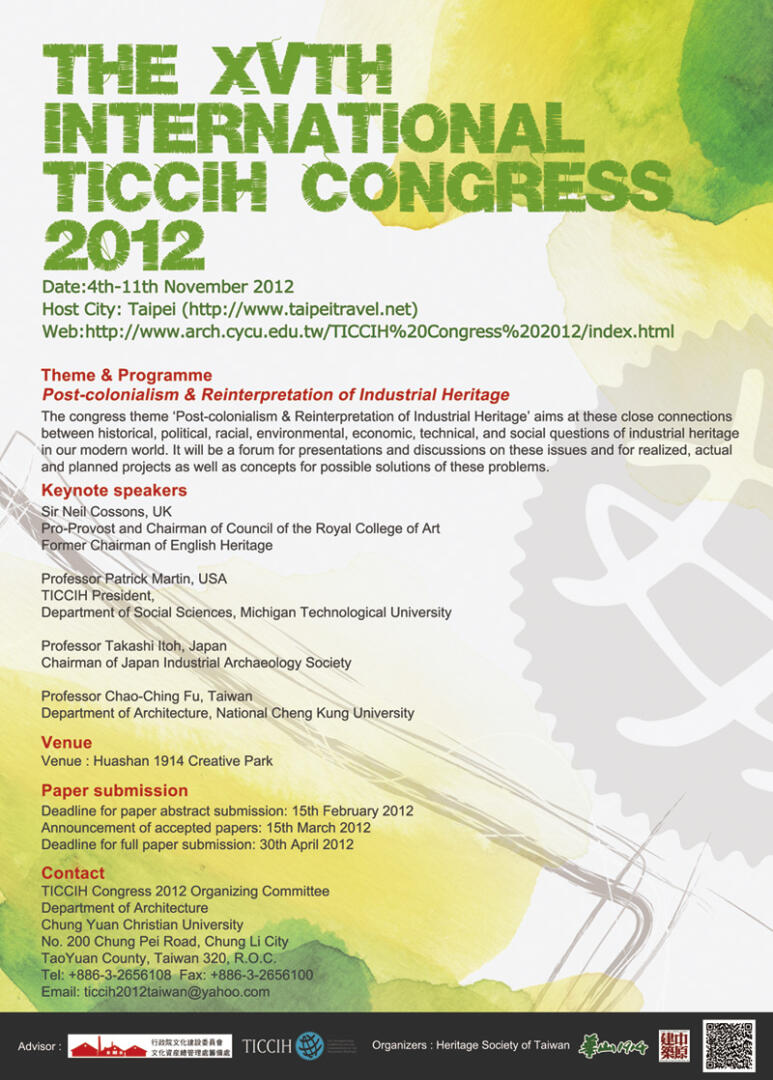 El XV Congreso Internacional de TICCIH «Post-colonialismo & Reinterpretación del Patrimonio Industrial» que se celebrará del 4 al 11 de noviembre de 2012 en Taipei (Taiwan) ha recibido ha recibido más de 70 resúmenes de ponencias dentro de las cuatro secciones planteadas: